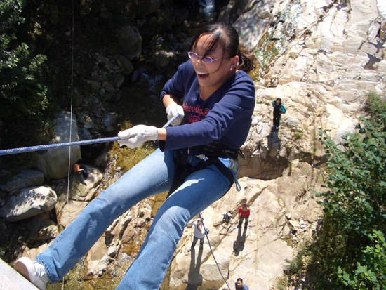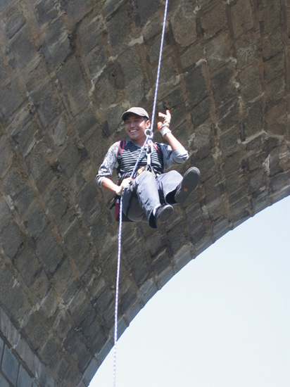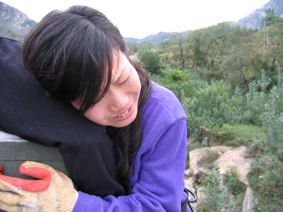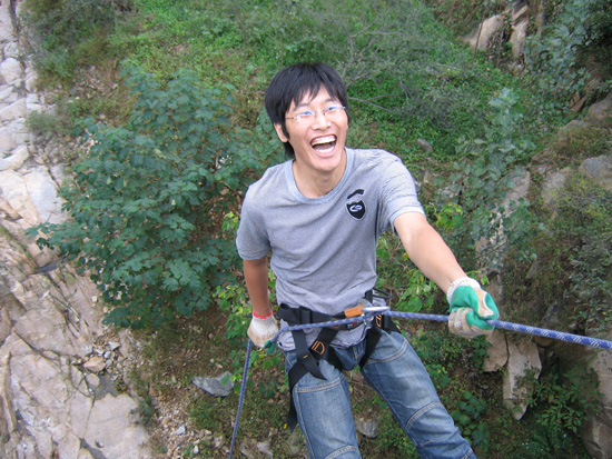 第一個項(xiàng)目是速降,就是從幾十米高的地點(diǎn)跳下,當(dāng)然是要系安全帶的。我們采用的是坐式、主腰扣、八字環(huán)、手套……然后……跳下來……自己掌握下降的速度、落點(diǎn),以到達(dá)地面。速降并不需要嚴(yán)格的專業(yè)技巧,但只要開始下降,就無法退縮,必須克服恐懼與障礙、堅(jiān)持到底。從自我激勵、自我控制到超越自我,最終走向成功。這是對自己極限的挑戰(zhàn),一開始有些同事不敢下降,但是看到好多人都已經(jīng)安全地下去了,也沉不住氣想要去嘗試一下了,最終在大家的鼓勵與隊(duì)長的指導(dǎo)下跳了下來,當(dāng)腳著地的那一刻,心中的恐懼、疑慮都已全部消散,取而代之的是戰(zhàn)勝自我的喜悅,那也是一種感動,為自己的成功而感動!