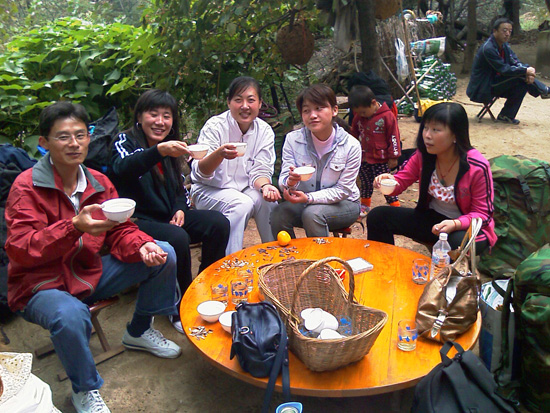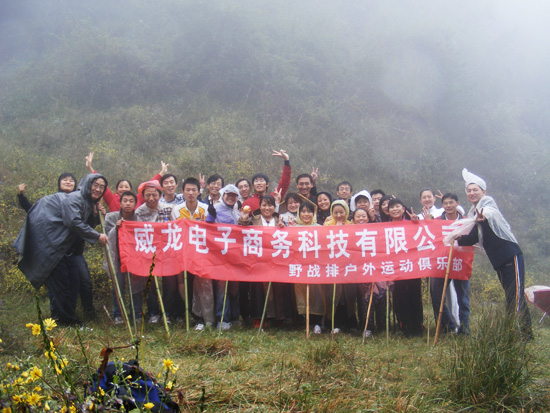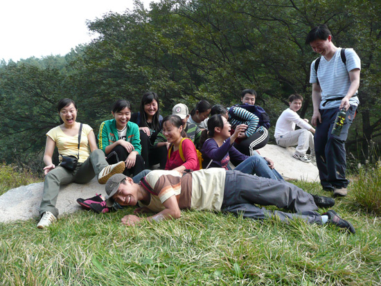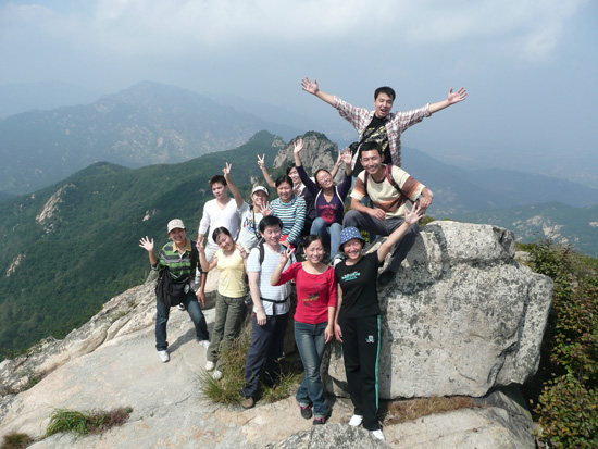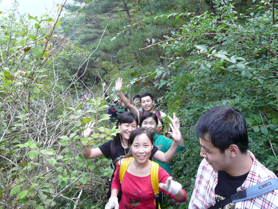 清晨的山峰全都彌漫在了朦朧的薄霧中,一番收拾之后,開始了我們的云峰之行。山路是崎嶇的,其實(shí)也算不上是條路,只是走的人多了而踩成的一條羊腸小道,有的地方需要手腳并用才能爬上去。一路上,大家相互你拉我一下,我推你一把,有難走的地方都是互相提醒注意腳下的路滑。有人想要放棄的時候,大家一齊鼓勵他,為他加油。我們當(dāng)中的每個人都被這種團(tuán)隊(duì)精神所感動。尤其是在最后攀巖的過程中,我們互相鼓勵,相互攙扶,硬是攀上了高十幾米的陡峭懸崖,到達(dá)峰頂。我們歡呼雀躍,盡情歡呼,享受“一覽眾山小”的喜悅。