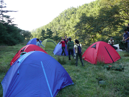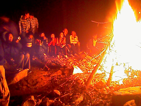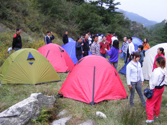 夜晚,小溪邊,我們?nèi)计鹆梭艋?,唱起大家熟悉的歌,每個人都被熊熊火焰感染著,臉上洋溢著成功的喜悅和輕松的歡愉。直到深夜,我們?nèi)跃镁貌辉鸽x開這暖暖的篝火?;氐綆づ?,雖然入秋的天氣已經(jīng)有了涼意,但每個人的心里都是暖的,疲倦和勞累,蕩然無存。帳篷外,泉水叮咚,蟲鳴草戲,帳篷內(nèi),笑聲不絕,竊竊絲語。