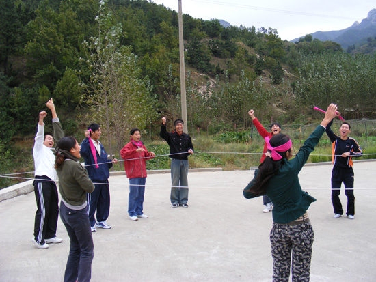 然后是經(jīng)典團(tuán)隊(duì)合作項(xiàng)目盲人方陣,所有的隊(duì)員被蒙上眼睛,在最短時間內(nèi),將一根繩子拉成一個最大的正方形,并且所有隊(duì)員都均分在四條邊上。這個項(xiàng)目難度很大,但是大家在一番爭論之后,很快就選出一位隊(duì)長來指揮安排,憑著感覺將這根長繩組成了一個正方形。其中該有的合作配合,該有的沉默聽從指揮,大家都完成的非常好。大家分享著這來自團(tuán)隊(duì)合作成功的喜悅,這也說明了我們這個團(tuán)隊(duì)是一個聽指揮、懂配合、有默契的優(yōu)秀團(tuán)隊(duì)。