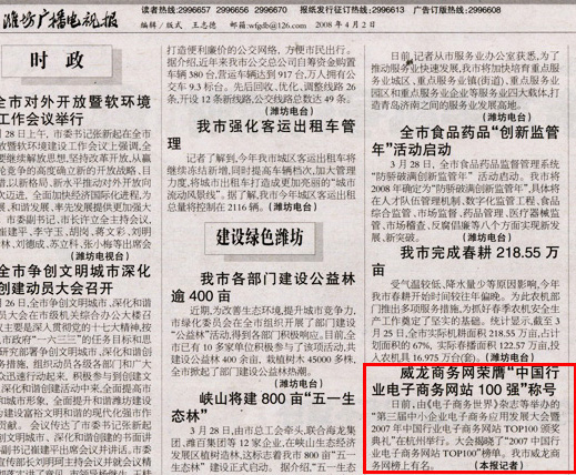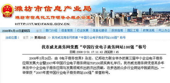 威龍商務(wù)網(wǎng)上榜“2007中國行業(yè)電子商務(wù)網(wǎng)站100強”