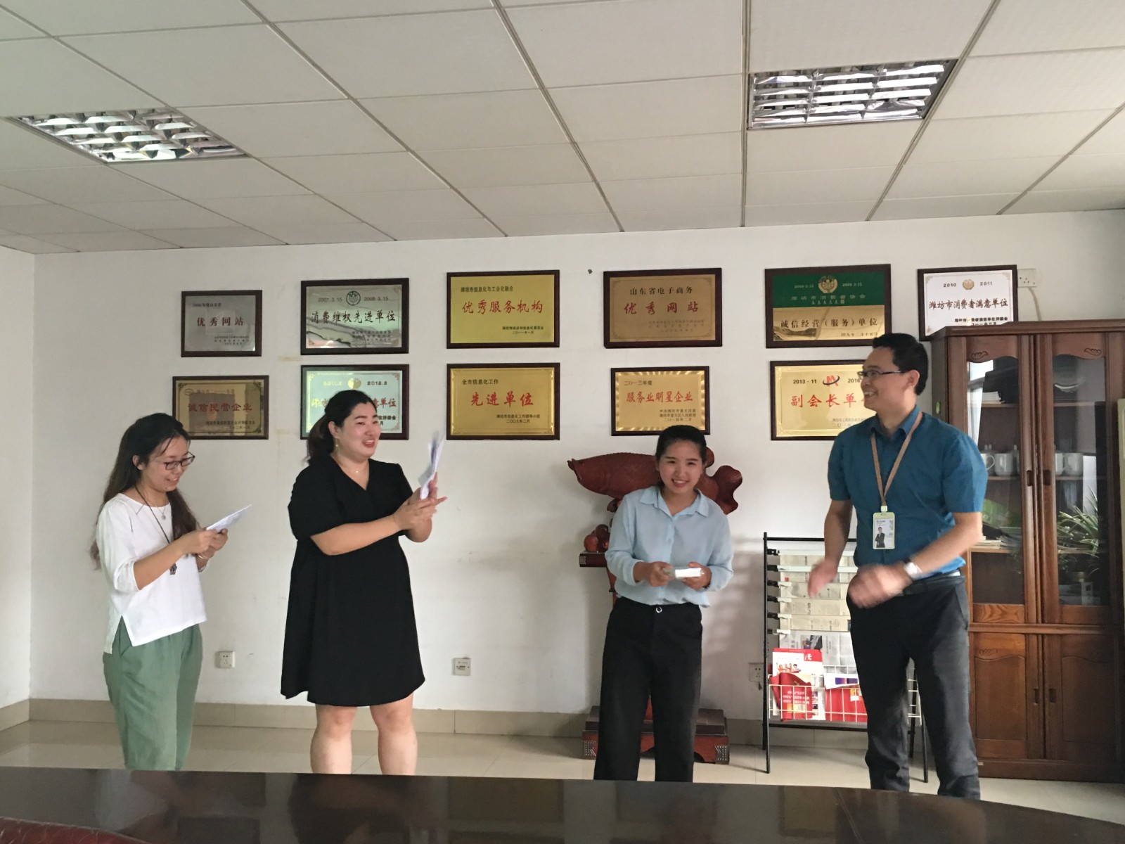 8月份積分游戲前三名獲獎(jiǎng)?wù)呃顣孕瘛⒗罱?、代凱利分別由王翠萍總經(jīng)理、趙耀副總經(jīng)理、王杰副總經(jīng)理給獲獎(jiǎng)?wù)哳C發(fā)獎(jiǎng)品